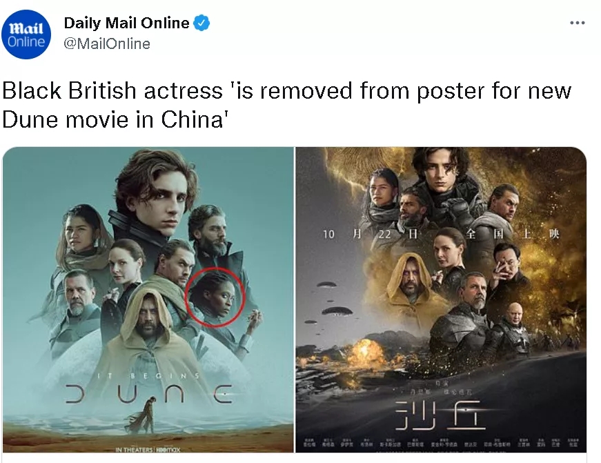 Как показано на рисунке ниже, на прошлой неделе западные СМИ во главе с британскими Daily Mail и The Times опубликовали ряд новостей о том, что исполнительница одной из главных ролей в фильме ?Дюна? (2021 года), чернокожая актриса Шэрон Дункан-Брюстер (Sharon Duncan-Brewster), была "исключена" из афиши фильма китайской версии и заменена китайским актером Чжан Чжэнь.