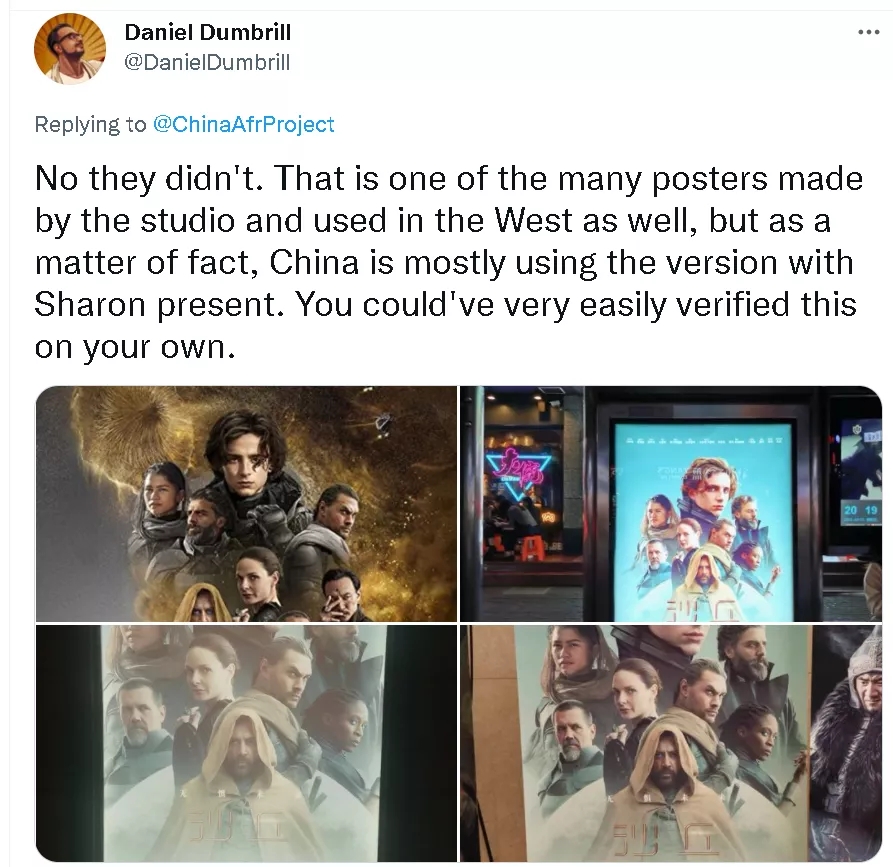 Некоторые иностранные пользователи сети обнаружили, что ?Дюна? использовала несколько вариантов афиши на китайском рынке, в том числе и с изображением черной актрисы, и китайцем. Разные версии афиши были использованы также и в самих США. Поэтому нельзя сказать, что в Китае именно "удалили" черную актрису.