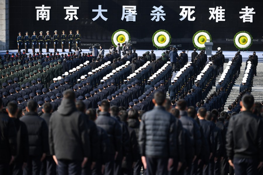 13 декабря 2021 года, церемония по случаю 8-го Национального дня поминовения жертв массовой резни в Нанкине проходит в Музее памяти жертв массовой резни в Нанкине, совершенной японскими захватчиками, в пров. Цзянсу на востоке Китая. /Фото: Синьхуа/