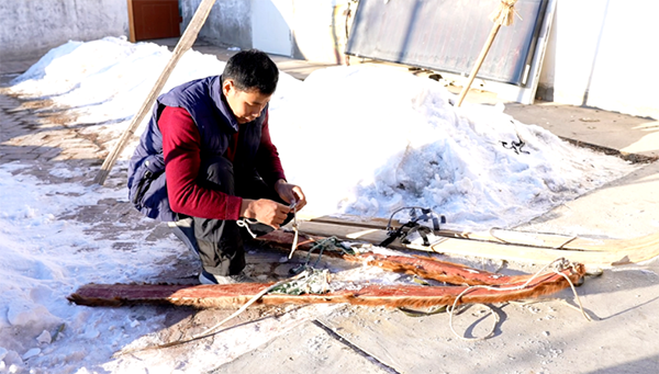 32-летний житель в Округе Алтай Алалибек Хабдат использует старинные меховые лыжи уже более 20 лет. Зимой, если чей-либо скот ?застревает? глубоко в горах, Алалибек всегда приходит на помощь.