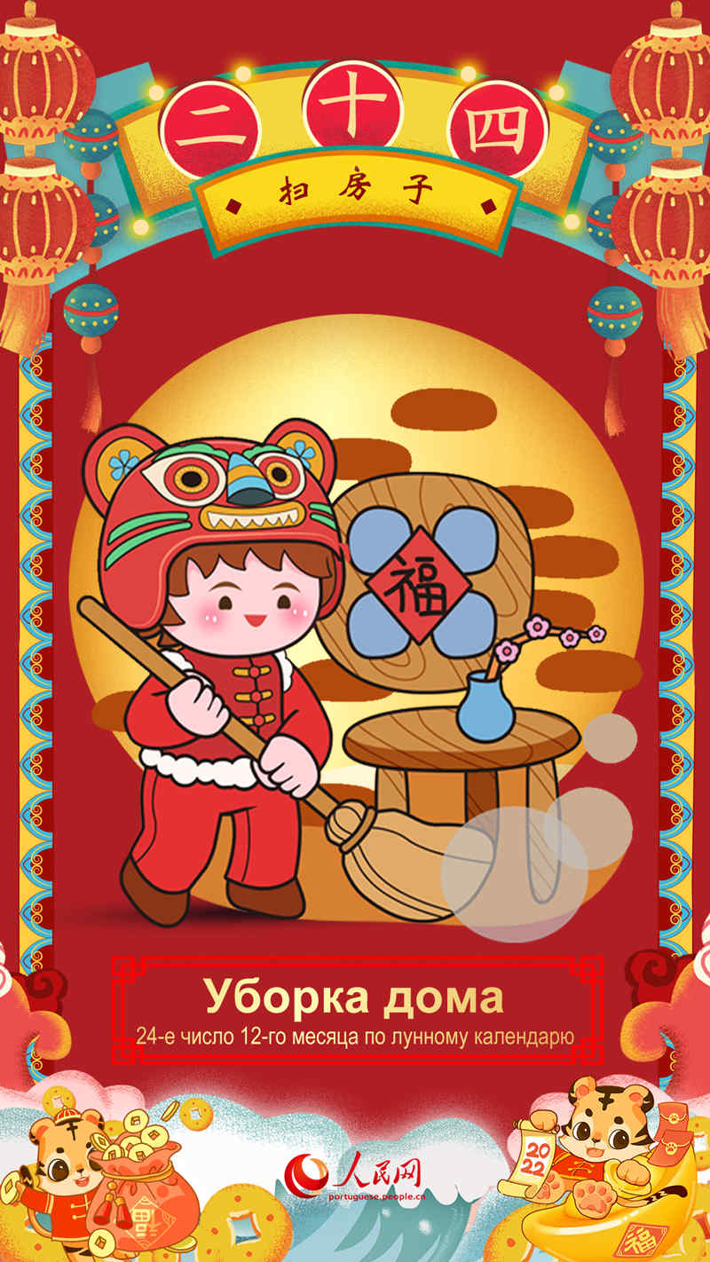 24-го числа 12-го месяца по лунному календарю люди посвящают себя уборке дома, это день очищения помещения в преддверии праздника Весны. Для того, чтобы хорошо встретить Новый год, необходимо избавиться от всего того, что накопилось за год, встретить новое начало.