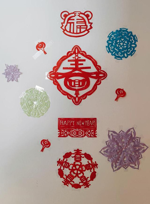 Вырезки из бумаги к китайскому Новому году, сделанные Че Цзяи и другими волонтерами для делегаций
