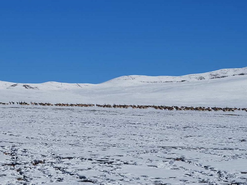 2 марта, ?Жэньминь жибао? онлайн -- Нгари - округ в Тибетском автономном районе КНР, на его территории находится огромное пастбище Цянтан, где живут более 100 000 тибетских антилоп. Жэньцзэн Лобу, начальник Управления лесного и травяного хозяйства уездного уровня, приехал сюда рано утром, чтобы покормить и проверить живущих здесь тибетских антилоп.