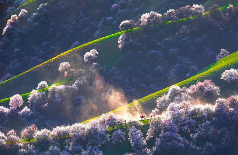 11 апреля, ?Жэньминь жибао? онлайн -- Цветут абрикосы в первозданной абрикосовой роще, расположенной в долине Налати (город Турген, уезд Синьюань, Синьцзян). Распустившиеся цветы абрикоса полностью усеяли собой склоны гор.