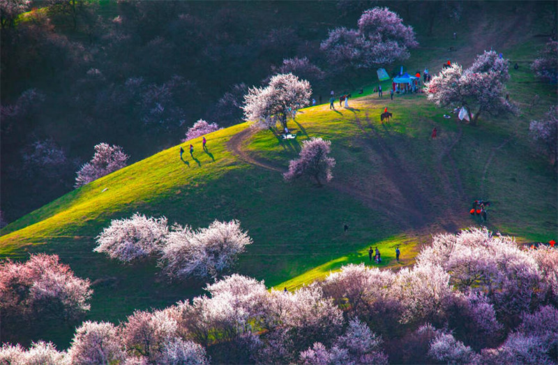 11 апреля, ?Жэньминь жибао? онлайн -- Цветут абрикосы в первозданной абрикосовой роще, расположенной в долине Налати (город Турген, уезд Синьюань, Синьцзян). Распустившиеся цветы абрикоса полностью усеяли собой склоны гор.