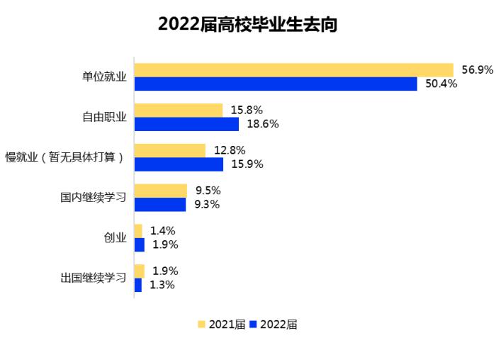 В то же время доля выпускников, желающих работать в микропредприятиях и малых предприятиях в 2022 году, составила 3,6% и 34,4%, что выше показателей 2021 года-1,8% и 28,7% соответственно. Это прагматичный выбор на фоне стресса, вызванного поиском работы.