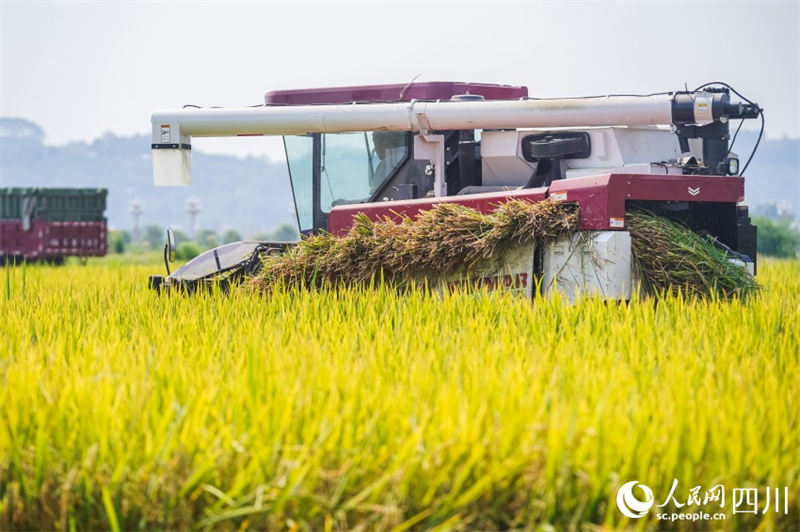 26 августа, ?Жэньминь жибао? онлайн -- На днях в общине Уху улицы Гуаньинь района Пэншань города Мэйшань / провинция Сычуань, Китай/ два комбайна работали в полях, занятые уборкой риса. В последние дни в районе Пэншань был собран хороший урожай риса. В этом году площадь яровых зерновых культур, посеянных в этом районе, составляет 186 500 млн му, в том числе 145 200 млн му риса и 25 400 млн му кукурузы. Предполагаемый урожай летнего зерна составляет 98 700 тонн.-0-