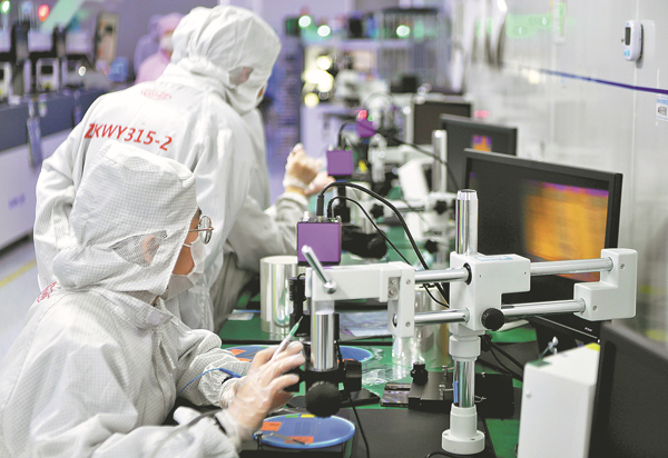 Рабочие на производственной линии микросхем технологической компании в городе Шиши провинции Фуцзянь