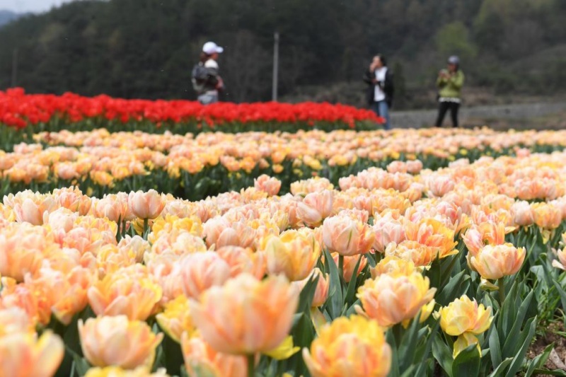 4 апреля, ?Жэньминь жибао? онлайн --? В эти дни горная деревня Уцзян в уезде Пуцзян города Цзиньхуа /провинция Чжэцзян, Юго-Восточный Китай/ утопает в море тюльпанов, притягивая к себе множество туристов и фотографов.?