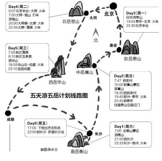 Днем он поднимался в горы, вечером садился на поезд до следующего места, таким образом, за пять дней ему удалось посетить все пять пиков. Нань Додо отправился в путь 28 апреля после работы, вернулся обратно на работу 4 мая.