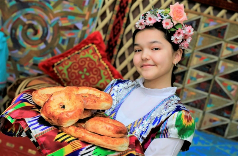 Девушка в народном костюме демонстрирует традиционные казахские блюда на празднике Навруз. Астана, Казахстан.