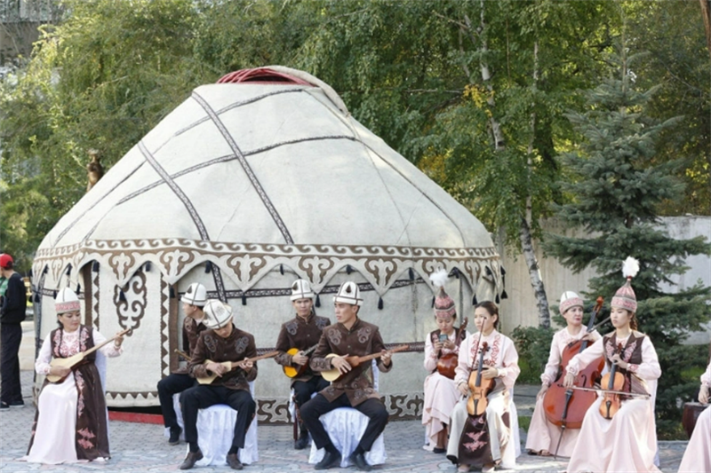 Музыканты в народных костюмах исполняют традиционные музыкальные произведения. Бишкек, Кыргызстан.