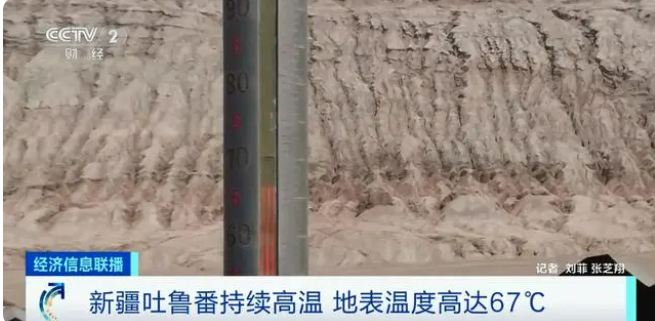 16 июня, ?Жэньминь жибао? онлайн -- В последние несколько дней в городе Турфан, который известен как ?остров огня?, и расположенный в Синьцзян-Уйгурском автономном районе, стоит жаркая погода. В живописном районе горы Хояньшань в Турфане накатывают волны жары, электронный термометр показывает, что температура поверхности земли достигает 67 ℃. Необычно жаркая погода привлекает многочисленных туристов на себе испытать этот зной. Для предотвращения солнечного удара в центре приема туристов есть комнаты отдыха с кондиционерами, а также предусмотрены лекарства против солнечного удара.