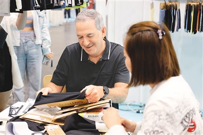Клиент (слева) выбирает ткань на стенде китайского предприятия из Шанхая на 24-й Китайской выставке текстиля и одежды в Нью-Йорке, США, 19 июля 2023 года. Фото: Се Е, агентство ?Синьхуа?