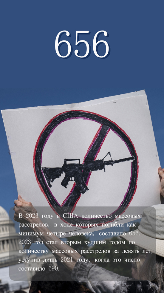 3 января, ?Жэньминь жибао? онлайн -- В 2023 году в США участились случаи насилия с применением огнестрельного оружия, трагедии с жертвами продолжаются. Согласно данным на сайте организации Архив насилия с применением огнестрельного оружия (Gun Violence Archive), в 2023 году в США количество массовых расстрелов, в ходе которых погибли как минимум четыре человека, составило 656, в результате различных инцидентов, связанных с применением оружия, погибли 42 тыс. 920 человек. Постоянные массовые расстрелы нанесли огромные трудноизлечимые раны американскому обществу, серьезно подорвав права людей на жизнь. Однако на фоне нынешней политической поляризации в США сложно добиться эффективного контроля над огнестрельным оружием, насилие с его применением уже стало хронической болезнью американского общества.