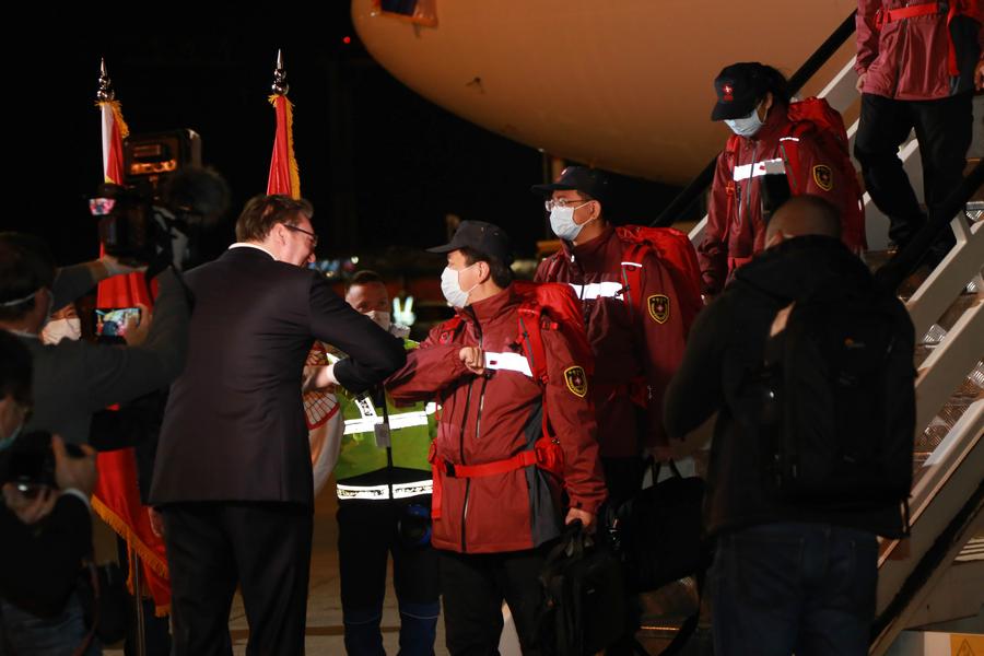 Китайские медики приземлились в белградском аэропорту Никола Тесла поздней ночью. А. Вучич возглавил группу высокопоставленных чиновников, отправившуюся встретить экспертов. Так как во время пандемии рекомендовалось отказаться от рукопожатий, сербский лидер поприветствовал каждого члена китайской группы, прикоснувшись локтем. Он также поцеловал китайский государственный флаг в знак благодарности за своевременную поддержку Китая.