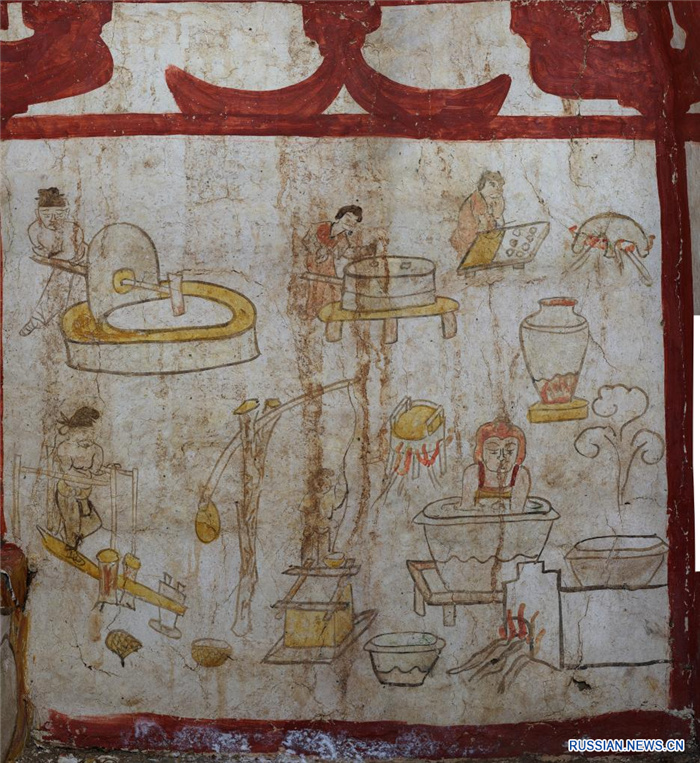 На одной из них изображены различные сцены работы, в том числе мужчина, использующий каменный каток для обдирания шелухи с зерна, женщина мелит муку каменными жерновами, мужчина, месящий тесто, и женщина, набирает воду с помощью древнекитайского подъемного устройства. На другой фреске изображены женщина в разноцветном платье, мужчина неханьской этнической группы с хлыстом в руках и изображения лошадей и верблюдов.