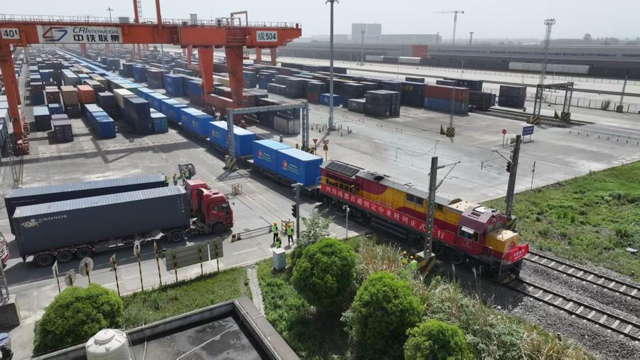 13 апреля 2025 года, отправление первого грузового поезда, курсирующего по маршруту Чэнду-Центральная Азия по определенному графику. /Фото предоставлено чэндуским отделением корпорации "Китайские железные дороги"/ |