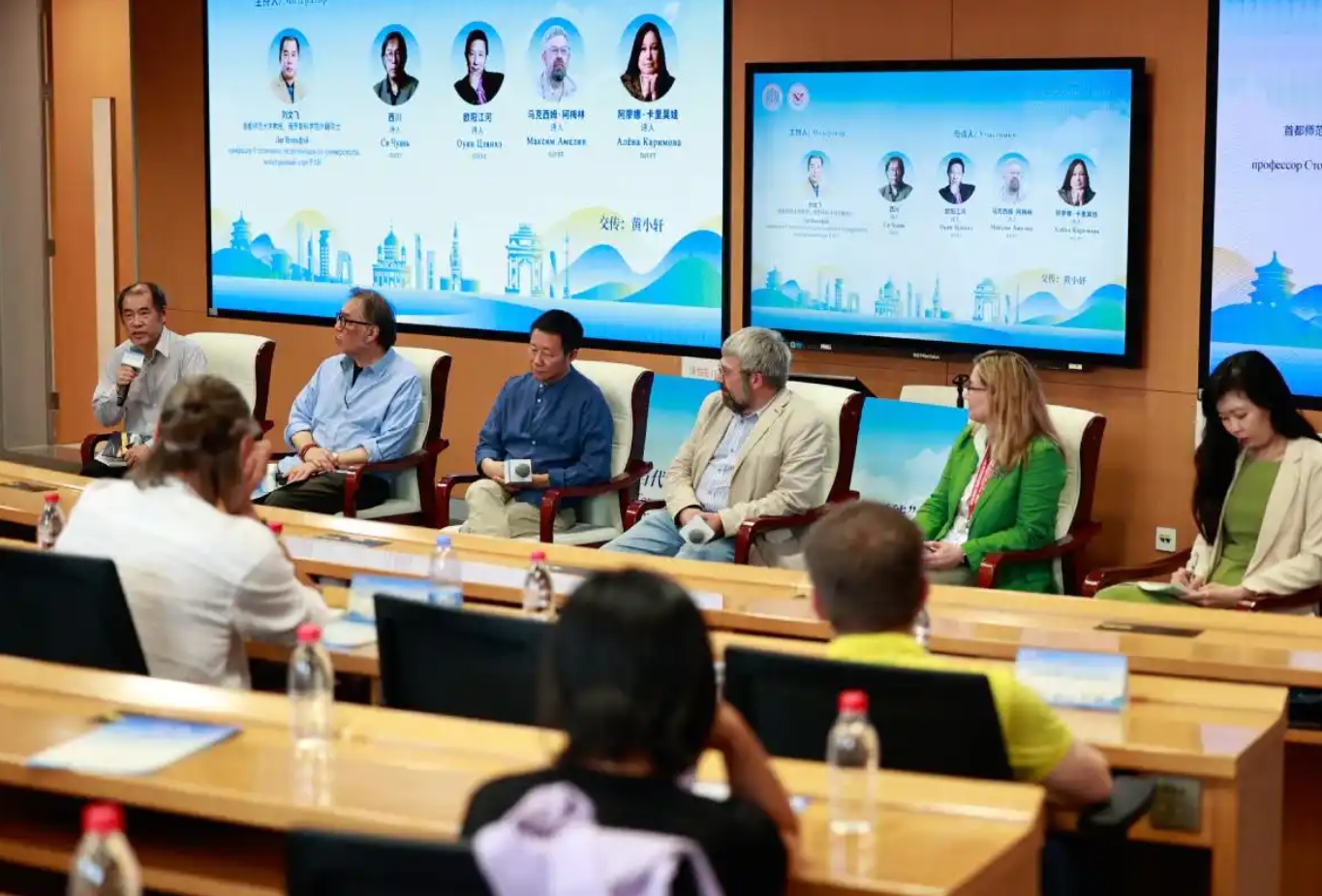 На утренней сессии профессор Лю Вэньфэй, китайские поэты Си Чуань, Оуян Цзянхэ и российские поэты Максим Амелин и Алена Каримова обменялись мнениями по таким темам, как женское поэтическое творчество, искусственный интеллект и перевод поэзии.