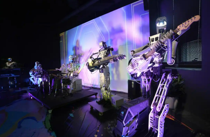 Роботизированная музыкальная группа в ресторане исполняет популярные композиции для посетителей.