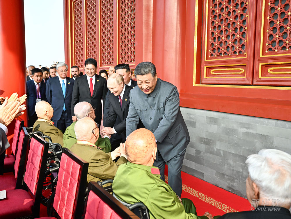 Пекин, 3 сентября /Синьхуа/ -- Председатель КНР Си Цзиньпин поднялся на трибуну Тяньаньмэнь и обменялся рукопожатиями с военными ветеранами, участвующими в торжественном собрании в честь Дня Победы.