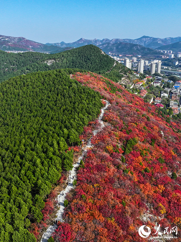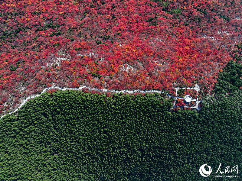 3 ноября, ?Жэньминь жибао? онлайн -- В разгар осени гора Сецзышань в городе Цзинань /провинция Шаньдун, Восточный Китай/ удивляет туристов контрастным пейзажем. Горный хребет делит Сецзышань на два склона: северный покрыт вечнозелеными соснами и кипарисами, а южный – зарослями скумпии кожевенной, листья которой осенью становятся насыщенно-красными. Этот контраст создает впечатляющую картину, когда одна гора словно раскрашена в два разных цвета.