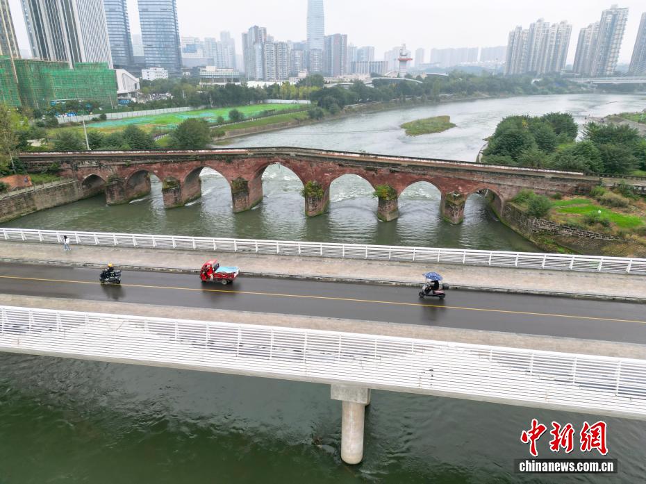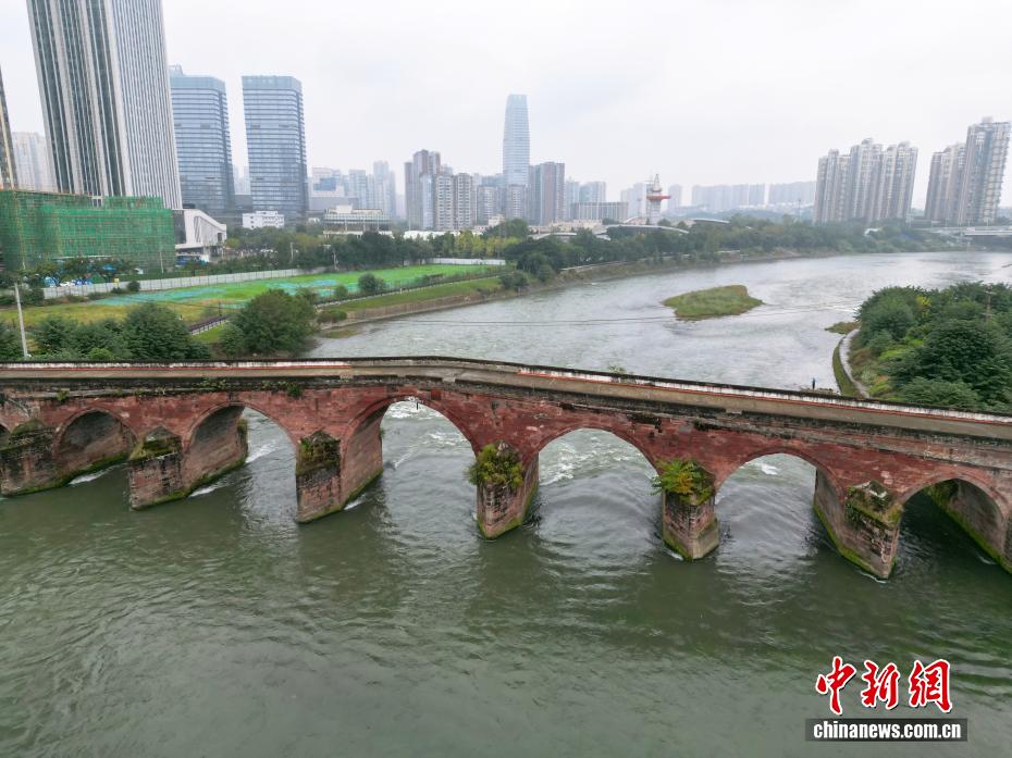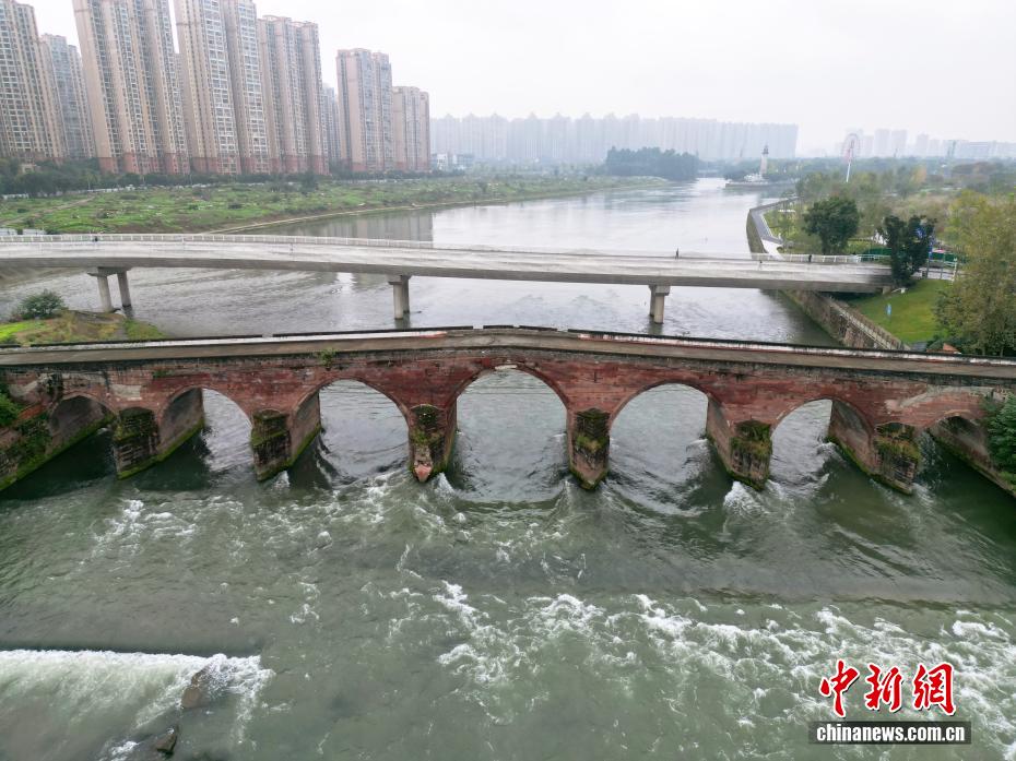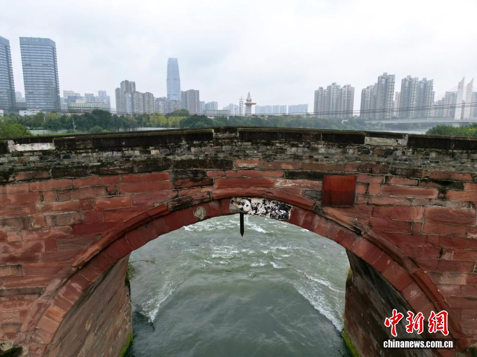 4 ноября, ?Жэньминь жибао? онлайн -- На днях на снимке древнего моста храма Эрцзян в Чэнду провинции Сычуань виден железный меч, подвешенный под его центральной аркой над рекой Цзиньцзян, создавая картину ?Древний мост с подвешенным мечом?. Этот каменный арочный мост, построенный во времена династии Цин, имеет более чем 200-летнюю историю. Конструкция моста и древний меч до сих пор хорошо сохранились и входят в список ключевых объектов культурного наследия провинции Сычуань, охраняемых государством. (Фото с дрона)