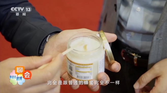 Вышедшее на китайский рынок 14 лет назад, ОсОО "Дары Тянь-Шаня" по производству меда и пчелопродукции уже три года подряд принимает участие в CIIE. Директор компании Эмма Савицкая, рядом с которой стоит переводчик, общается с потенциальными клиентами как из Китая, так и из других стран, раздавая им различные виды меда для дегустации.