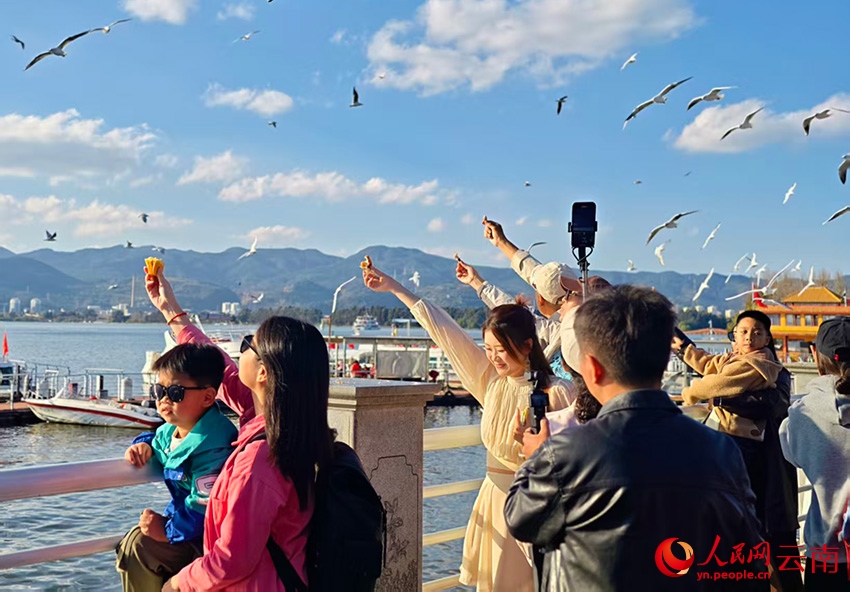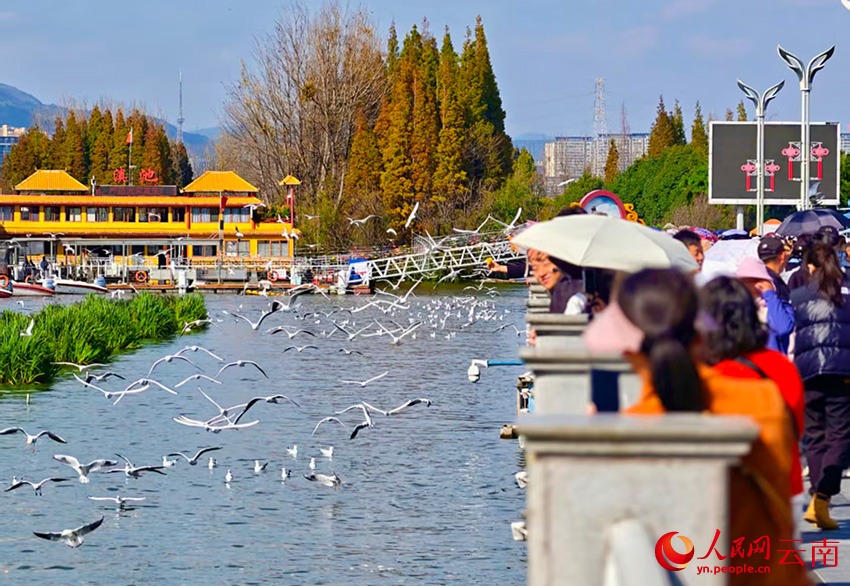 Над озером Дяньчи у дамбы Хайгэн кружат чайки, их силуэты отражаются в спокойной водной глади, а на фоне виднеются далекие горы Сишань. Горожане и туристы гуляют вдоль дамбы, кормят птиц с рук и фотографируют их.