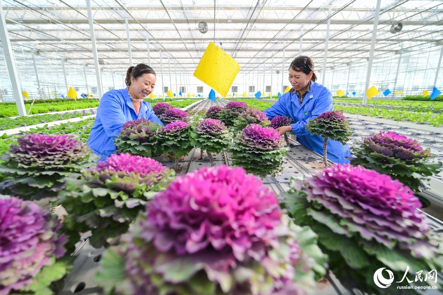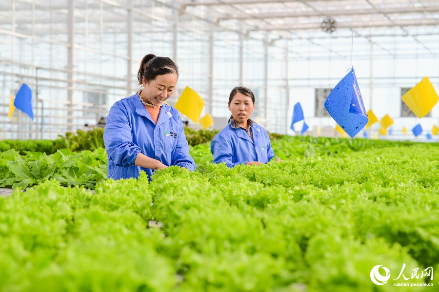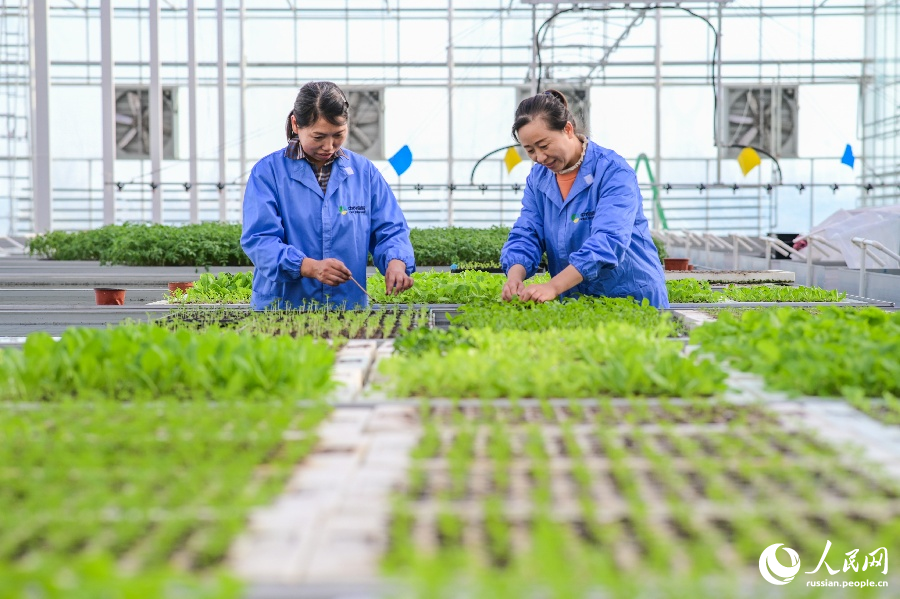 20 ноября, ?Жэньминь жибао? онлайн -- В Центре умных сельскохозяйственных технологий Национальной демонстрационной зоны развития новых сельскохозяйственных высоких технологий в городе Чанцзи Синьцзян-Уйгурского автономного района работники осуществляют уход за овощными культурами.