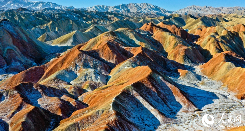 Красочные скалы в геопарке Чжанъе Данься в провинции Ганьсу покрыты снегом